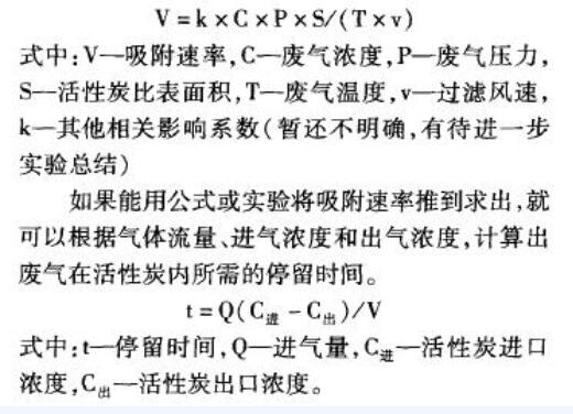實際中影響碳層吸附速率的因素有:吸附質(zhì)濃度、風(fēng)壓、溫度、活性炭比表面積等等,各條件參數(shù)之間的關(guān)系可以表示為以下公式: