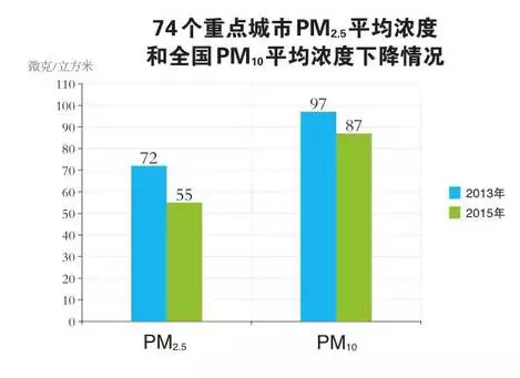 2015年,全國74個(gè)重點(diǎn)城市PM2.5平均濃度為55微克/立方米,相對(duì)于2013年的72微克/立方米下降23.6%;日均值超標(biāo)天數(shù)的比例由2013年的33.2%降至2015年的20.8%。全國PM10平均濃度(338個(gè)城市平均濃度為87微克/立方米),相對(duì)2013年(330個(gè)城市平均濃度97微克/立方米)下降10.3%;日均值超標(biāo)天數(shù)的比例由2013年的14.5%降至2015年的12.1%。74個(gè)重點(diǎn)城市共發(fā)生846天次重度污染和238天次嚴(yán)重污染,較2014和2013年降幅分別為28.1%、24.9%以及49.9%、63.7%。京津冀、長三角、珠三角和成渝地區(qū)NO2濃度相對(duì)2013年分別下降9.8%、11.9%、19.5%和15.8%,SO2分別下降44.9%、30.0%、38.1%和48.3%。衛(wèi)星資料反演顯示,2013~2015年,全國NO2和SO2垂直柱濃度年均值和顆粒物光學(xué)厚度(AOD)總體呈下降趨勢(shì),與地面監(jiān)測(cè)數(shù)據(jù)分析結(jié)果一致。