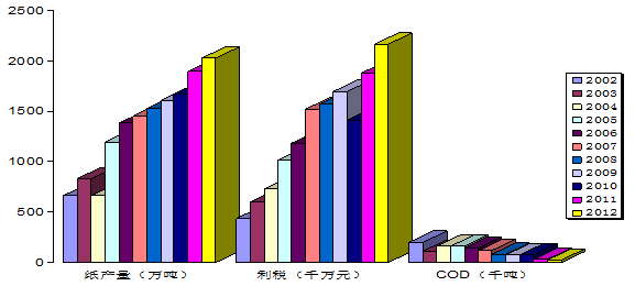 圖一??2002-2012年山東省造紙行業(yè)產(chǎn)量、利稅和COD排放量比較示意圖