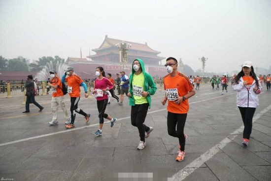 10月19日,2014年北京國際馬拉松賽如期舉行。霧霾再次襲來,當天的PM2.5指數(shù)達300多,不少參賽者戴上了各式各樣的高倍防護口罩?!氨M量用鼻子呼吸”的提醒、戴口罩跑馬拉松的反差,引發(fā)人們的深切思考。
