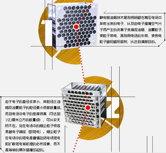 ?? 1、?油煙凈化器的電場使用圓筒蜂窩式結(jié)構(gòu),使靜電場能均勻地達(dá)到很大的平均電場強(qiáng)度,極大的增加了電場凈化面積,使電場與油煙粒子結(jié)合作用的時間更長,從而決定了設(shè)備具有極高的除油煙效率。?